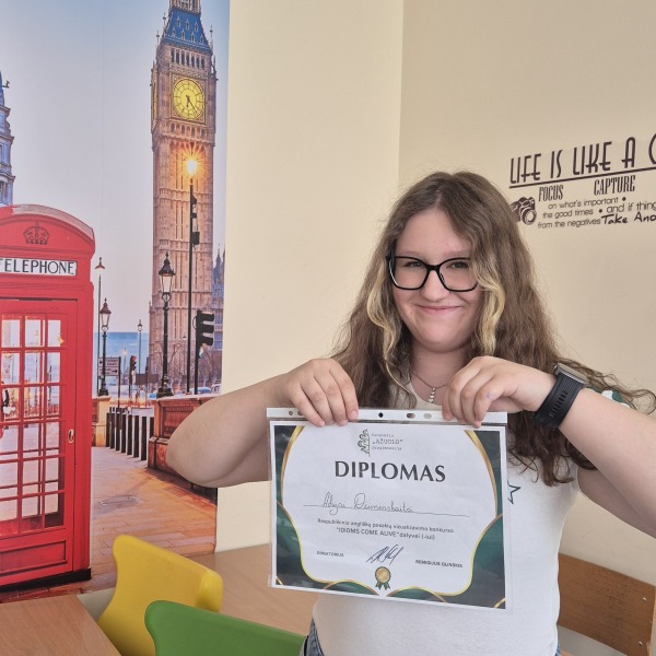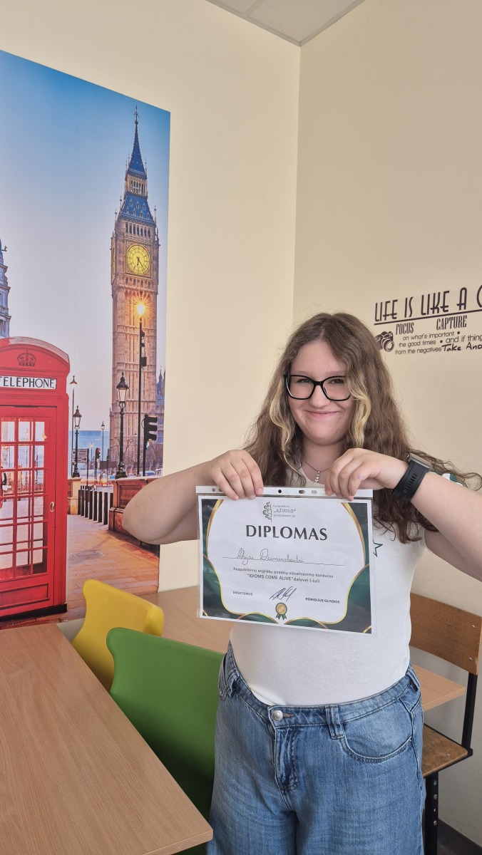 Adrija Dziminskaitė dalyvavo Panevėžio „Ąžuolo“ progimnazijos organizuotame respublikiniame Angliškų posakių vizualizavimokonkurese „IDIOMS COME ALIVE". Konkursas vyko visą kovo mėnesį. Teko posakį nupiešti ir užrašyti anglų kalba. Buvo puiki galimynė sužonoti, kokių yra angliškų posakių ir parodyti savo piešimo gabumus.